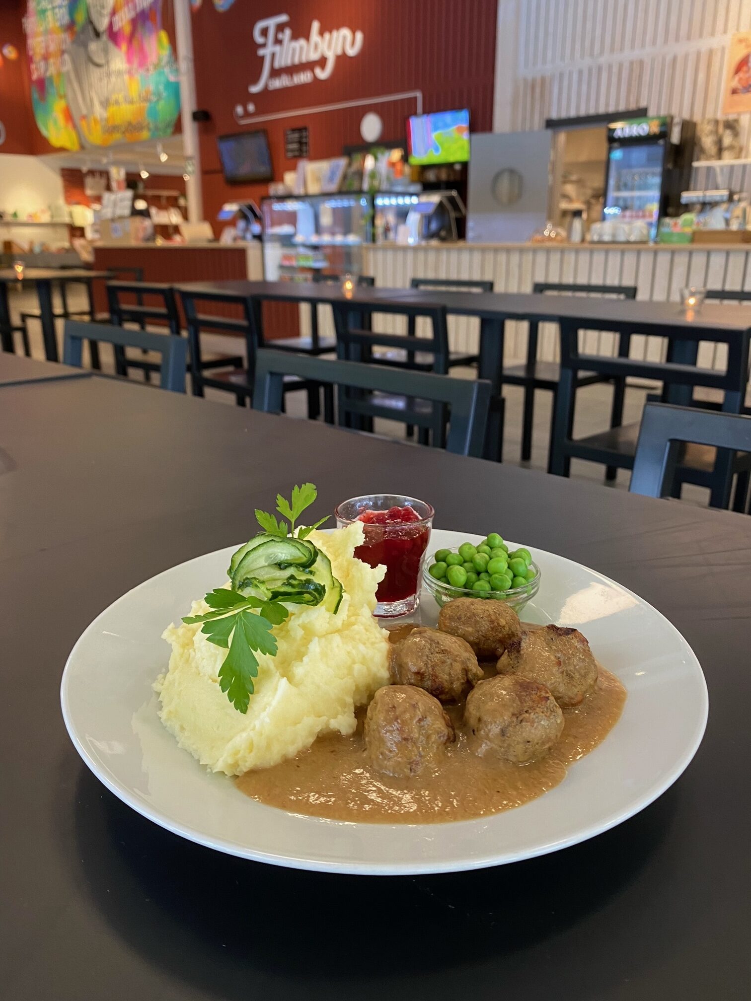 At Restaurant Skogen, you can enjoy Småland’s national dish: homemade meatballs with mashed potatoes, lingonberries, cream sauce, and pressed cucumber. Local ingredients are used, and all food is prepared from scratch. All dairy products are lactose-free, and there are always gluten-free options and vegetarian dishes on the menu.