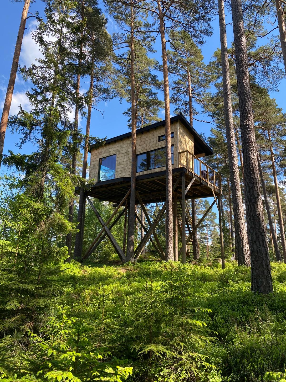 Stay in a 25-meter-tall wooden tower with panoramic views stretching 50 kilometers across the surrounding forest! This wooden masterpiece rests on eight tree trunks from the Mundekulla forest.
