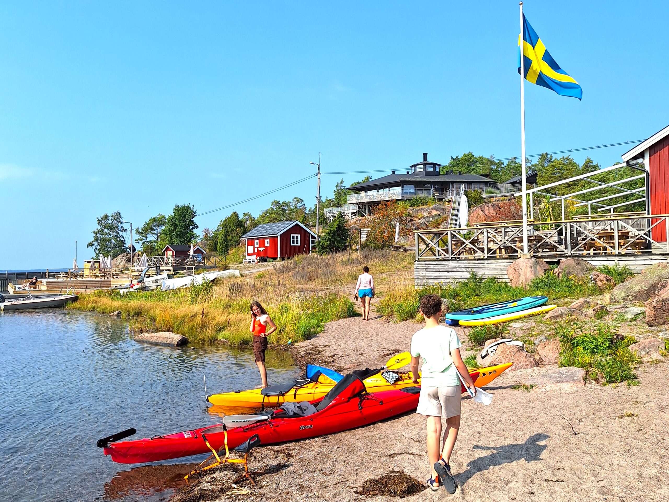 Na de lunch stappen we bij Outhoor hub in een kajak. Tot grote blijdschap van de kinderen passen we met zijn vieren in een kajak. Zij zitten in het midden, allebei met een zelfgemaakte zuurstok in de hand. We varen een stuk langs allerlei onbewoonde eilanden en leggen ergens in the middle of nowhere aan voor een fika met de lekkerste chocoladekoekjes!