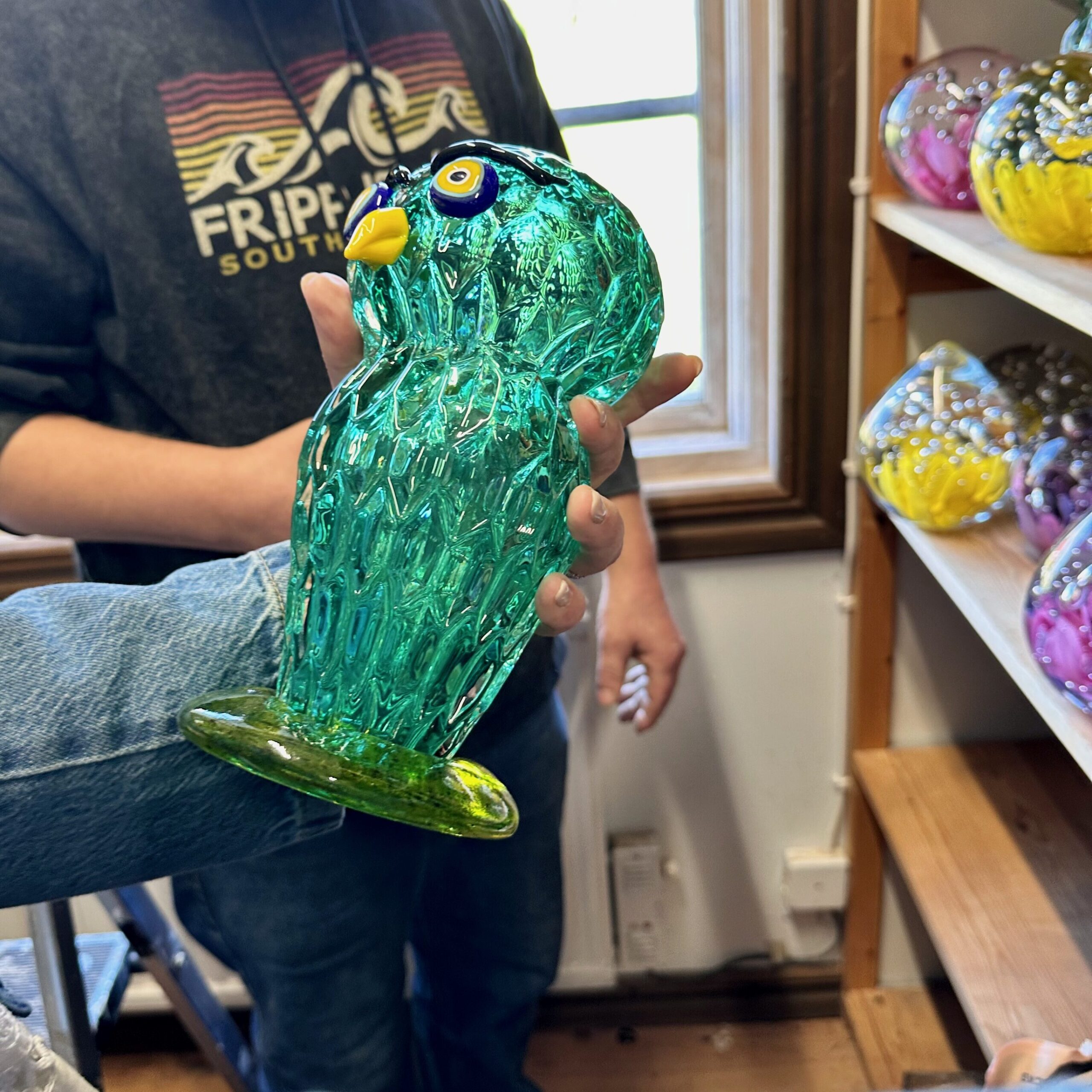 När jag besökte hyttan fick jag se två glasresor ta form. Både Dan och Lars arbetar utifrån sina egna idéer, men utvecklar dem tillsammans. Att se dem jobba var som att se en dans – ett samspel mellan kraft och precision. Men det är långt ifrån enkelt: glasmassan håller över 1100 grader. Idag fortsätter Dan att experimentera med sina ugglor, som ständigt utvecklas. Han använder formen från en lampa från Tivoli i Köpenhamn och formar sedan ögon, ögonbryn, tofsar – och ingen är den andra lik. I ett smidigt samspel växer den fram och vi får se den åka in i glasugnen.