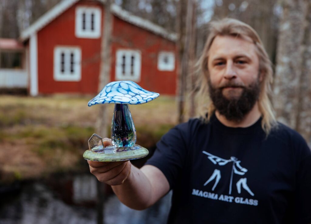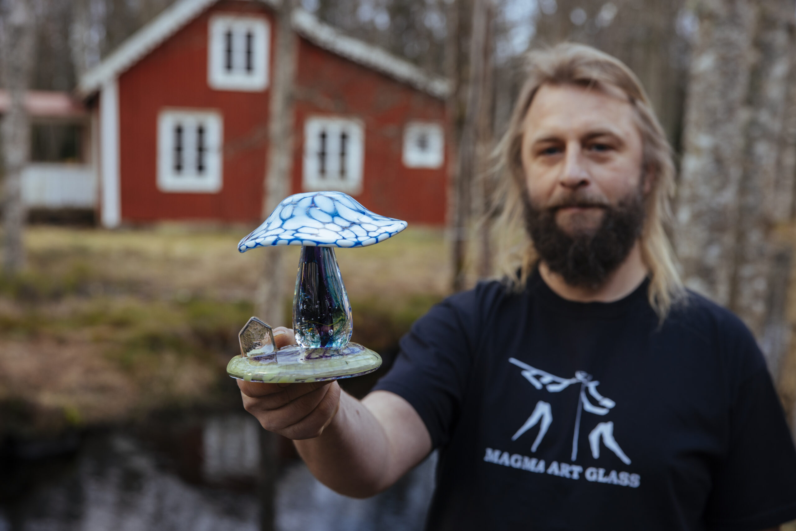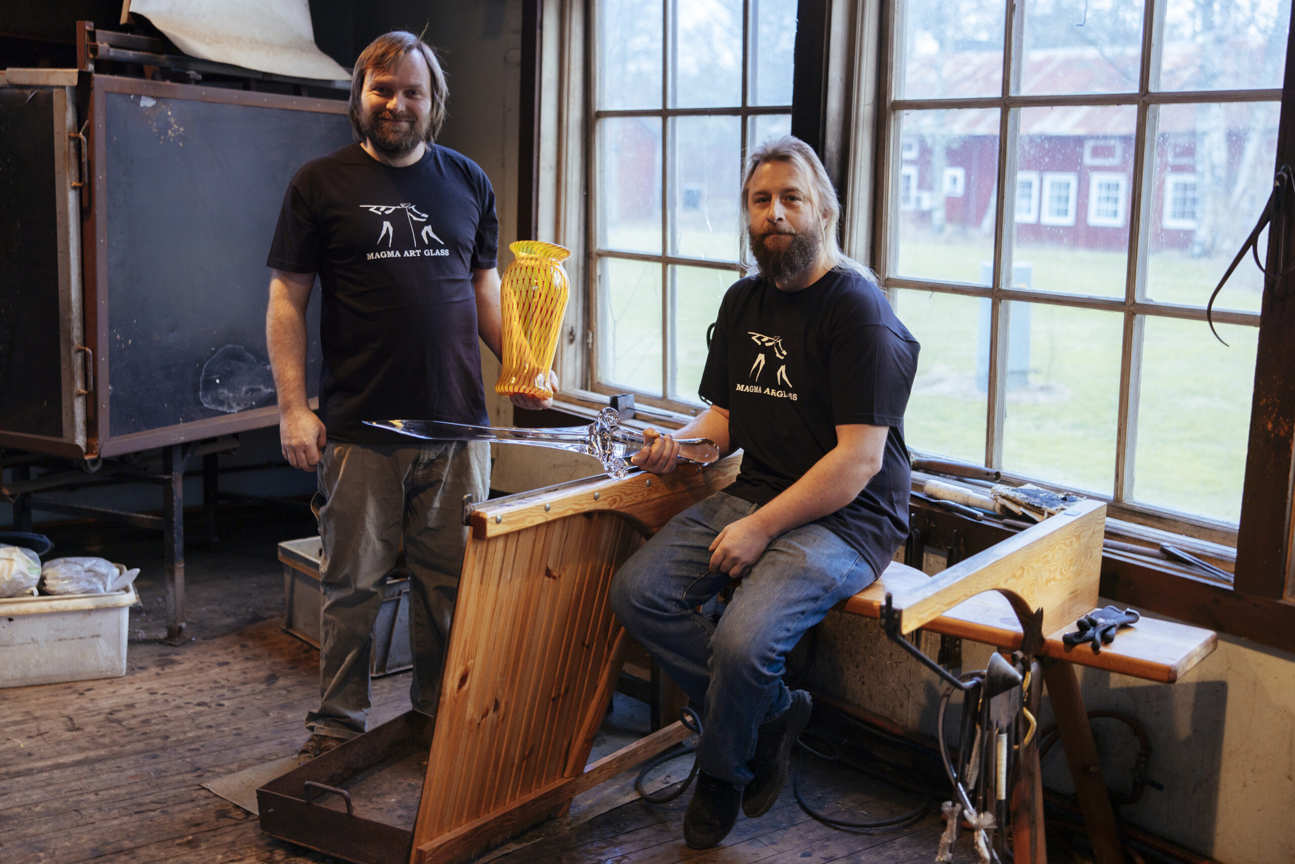 Under vår resa genom glasriket stannade vi till i Transjö. Jag mötte två glasblåsare som fann sin livsplats bland skogar, åar och glödande ugnar – och jag fick se magi ta form framför mina ögon. De förenades av kärleken till glaset och blev kvar – för att lära mer, och sedan för gott. I dag bor och verkar de på samma plats: sitt älskade Transjö. Jag mötte Dan och Lars, som tillsammans driver Magma Art Glass i hjärtat av Småland.