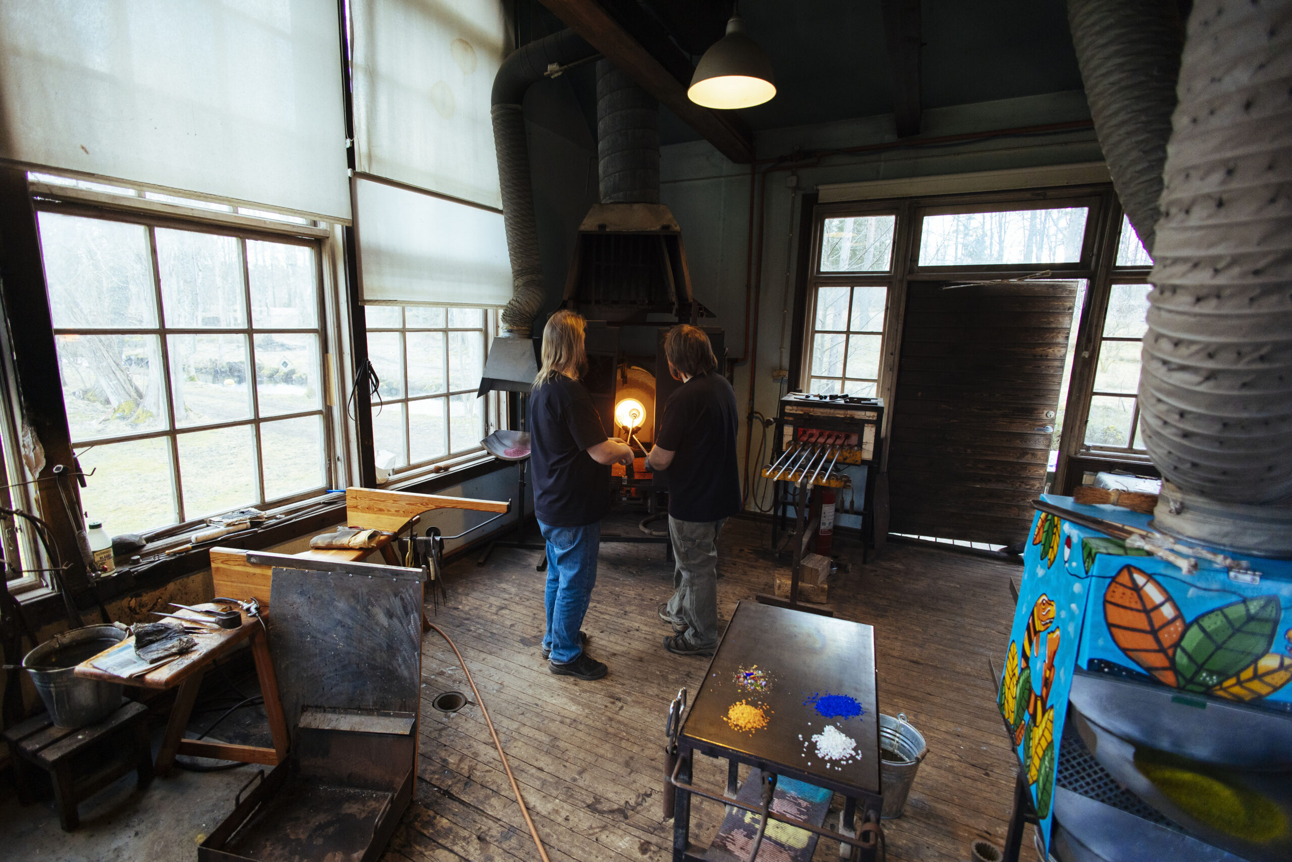 Dan är född i Danmark och berättade för mig hur han tidigt fick höra att om man ville lära sig glashantverket på riktigt, då skulle man till Småland – till mästarna Ritzman och Karlsson i Transjö. Han reste världen över, men i Japan kom hemlängtan. Där och då bestämde han sig: han skulle hem. Det visade sig att Hem var just Transjö i Småland. Det bästa med Småland tycker han är lugnet och naturen och byn Transjö förstås som han känner igen från filmerna om Emil i Lönneberga. Och här var jag hemma, sa Dan när vi pratade. Det fanns inga nöjen för en 20-åring, berättade han, men man fick jobba sig trött. Efter många år i lära driver han nu hyttan tillsammans med Lars.